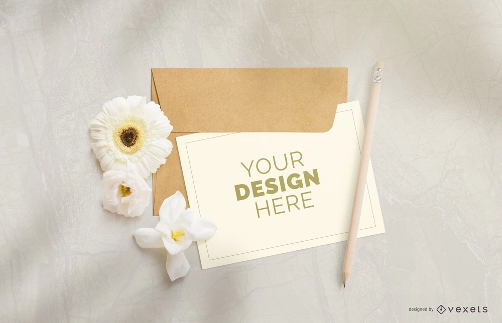 Beautiful mockup composition that features an editable card with an envelope and flowers around it. Place logos and images on our PSD Mockups and edit them with our easy to use smart objects for Photoshop.