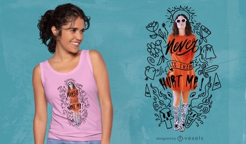 Cute t-shirt psd featuring a picture of a woman surrounded by doodles and the quote "Never let them hurt me". Use this editable t-shirt design PSD perfect for Print on Demand platforms like Merch by Amazon, Printful and more. Template comes with merch-ready PNG!