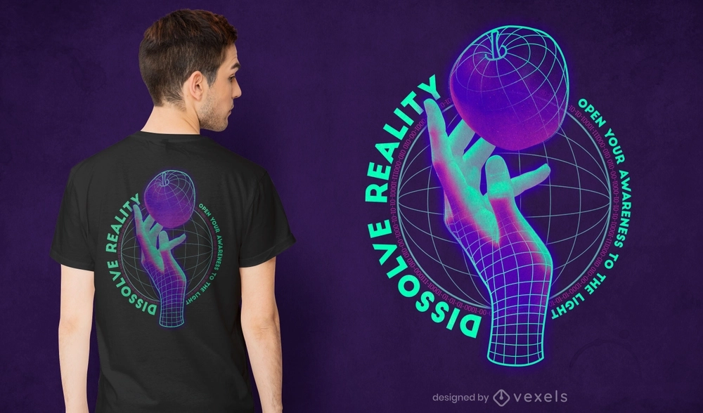 Incredible psd t-shirt featuring a wireframe hand with quote "Dissolve reality" in vaporwave-neon style. Download this editable PSD t-shirt design and sell merch on Print on Demand Platforms. Comes with the transparent PNG graphic and PSD.