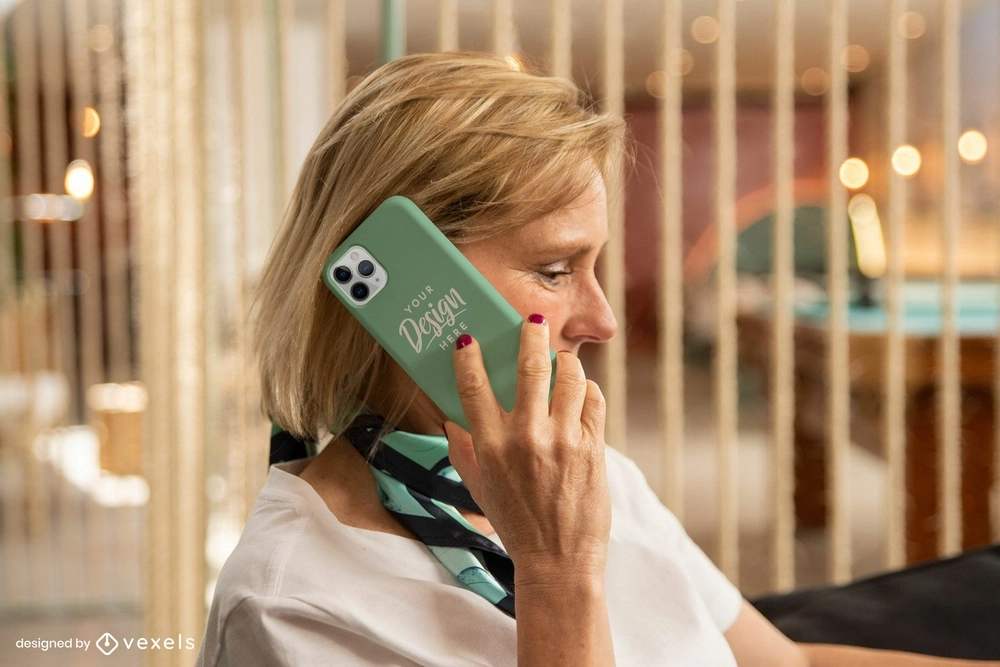 Cool mockup of woman with a mint green phone case. Use this editable PSD Mockup for Photoshop. Contains organized layers, easy to move props, and smart objects for an easy edit.