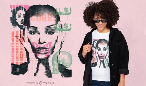 Amazing t-shirt psd featuring a woman with a butterfly, skull and the quote "Unconditional". Print Ready T-Shirt PSD design to sell merch on PODs. This editable tee template also comes with transparent PNG.
