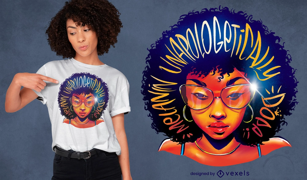 Awesome t-shirt psd featuring a black woman with with the quote "Melanin unapologeticall, dope". Print Ready T-Shirt PSD design to sell merch on PODs. This tee design also comes with transparent PNG.
