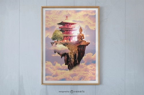 Cool poster psd that features a japanese temple and a buda over a flying rock. Take a look at this Print-Ready Poster Design to sell on Society6, Displate or your favorite POD platform. Perfect for framed prints, posters, floating prints and more!