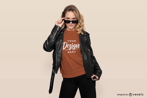 Amazing mockup design that features a female model wearing a leather jacket and an editable t-shirt. Place logos and images on our PSD Mockup and edit them with our easy to use smart objects for Photoshop.