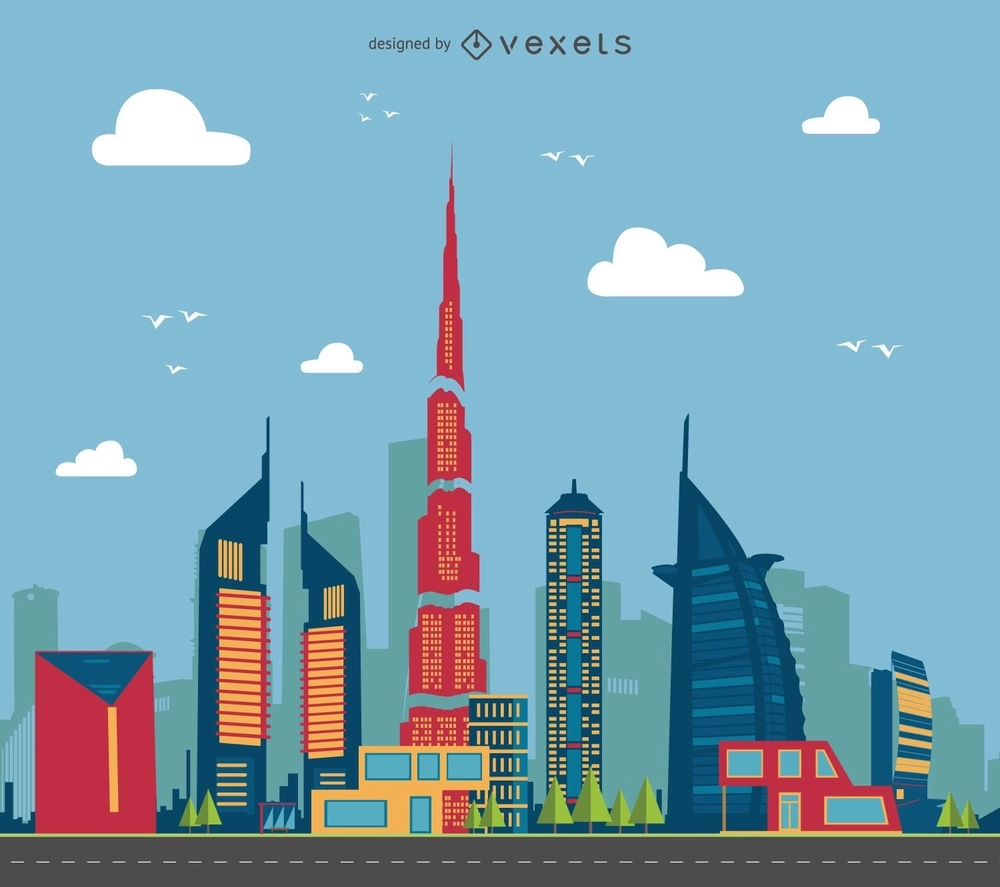 Illustrated Dubai city landscape that includes the cultural landmarks among houses trees and clouds. Colorful flat illustration.