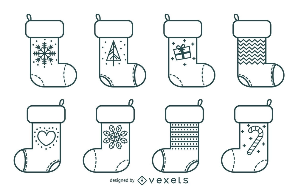 Set of isolated Christmas stocking designs. 8 flat illustrated stockings outlines with different drawings and designs.