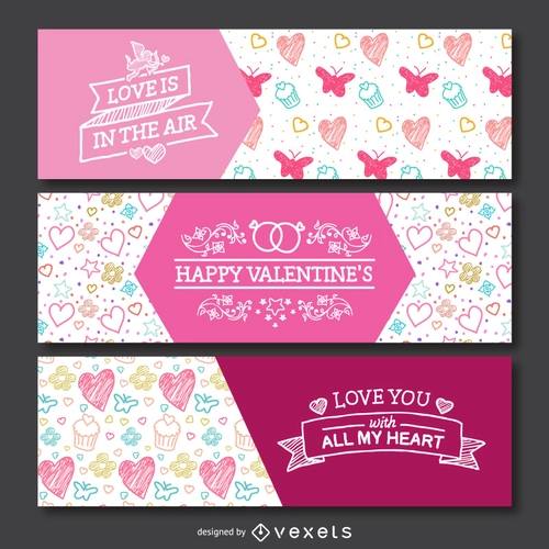 Set of three Valentine's Day banners featuring hand drawn hearts cupcakes stars and other elements. Each banner has its own illustrations in pastel tones. Happy Valentine's Day!