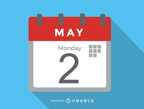 Simple office icon of a calendar with red top showing May 2nd Monday date. Suitable for office work schedule date calendar application designs and more
