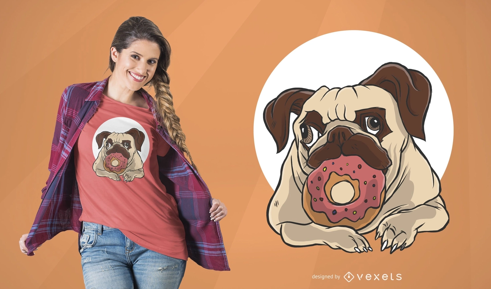 Pug with Donut T-Shirt Design featuring an illustration of a pug dog eating a pink colored donut. Can be used on t-shirts hoodies mugs posters and any other merchandise. Ready to use on Merch by Amazon and other print-on-demand platforms like Redbubble Teespring Printful and others.