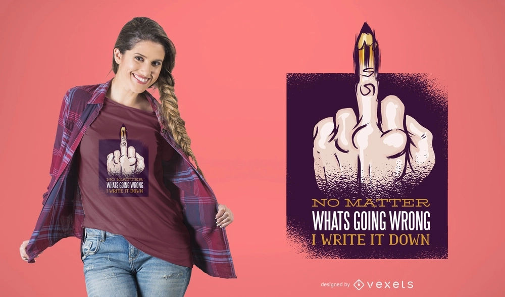 Writing Quote T-Shirt Design featuring an illustration of a hand that has it´s middle finger up which transforms into a pencil on it´s end. On the bottom text that reads: "no matter whats going wrong i write it down". Can be used on t-shirts hoodies mugs posters and any other merchandise. Ready to use on Merch by Amazon and other print-on-demand platforms like Redbubble Teespring Printful and others.