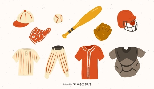 Different pieces of gear for the game of baseball. There's a uniform bat glove helmet hat umpire vest and a mitt for the fans. Designed in an old school and warm fasion.