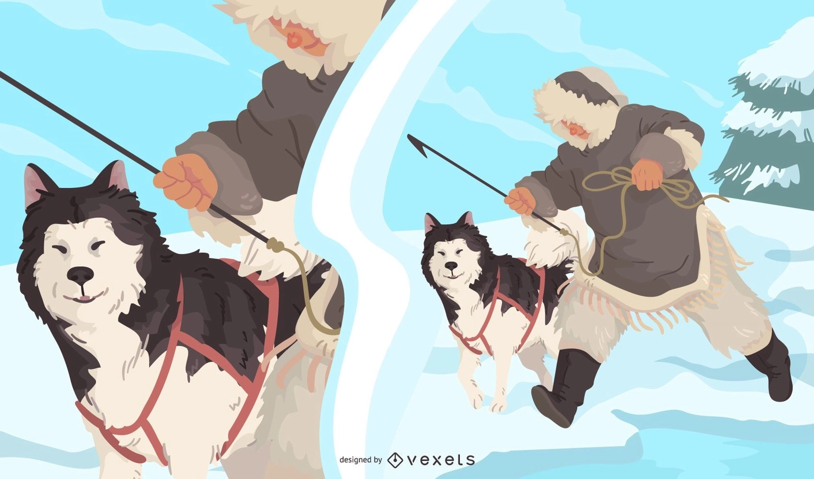 Awesome character illustration design featuring a Eskimo man hunting with a Husky dog. Edit and use this character design for your motion graphic projects website designs banners social posts and more. Editable colors and shapes using Illustrator.