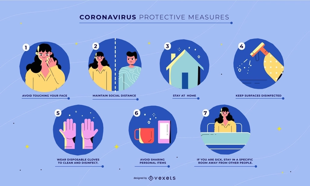 Infographic template about Coronavirus showing protective measures such as keeping surfaces disinfected staying at home and more. Present your ideas visually with this infographic template.