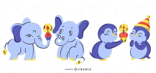 Cute birthday themed illustration set featuring elephants and penguins celebrating and holding cupcakes. Each one can be used individually enjoy!