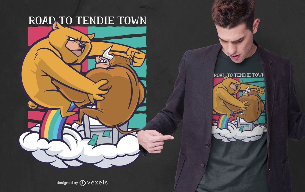 Awesome t-shirt design featuring a bear fighting a bull with the quote "Road to tendie town". Can be used on t-shirts hoodies mugs posters and any other merchandise. Ready to use on Merch by Amazon and other print-on-demand platforms like Redbubble Teespring Printful and others.