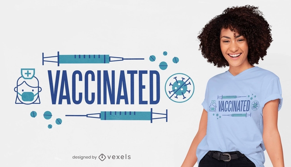Amazing t-shirt design featuring two vaccines and other coronavirus-related icons, with the quote "Vaccinated". Use this print ready design for tshirts, posters, mug, hoodies and other merch products. Eligible to be used on POD platforms like Merch by Amazon, Teespring, Redbubble, Printful and more.