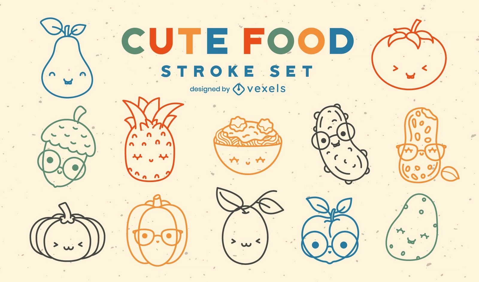 Cute food-themed set featuring several fruits, vegetables and other ingredients in line art kawaii style, such as pumpkins, tomato, apple, pear and more!