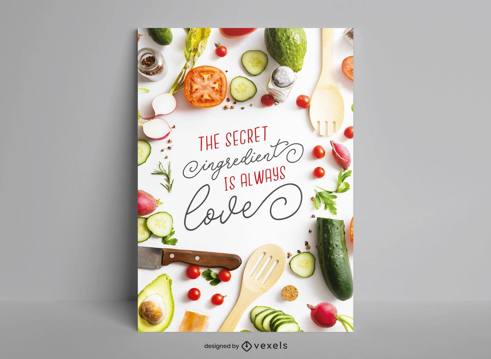 Amazing poster design featuring healthy food ingredients and the title "The secret ingredient is always love". Design a poster for your party, event, or business using our poster template containing editable text and colors for Illustrator.