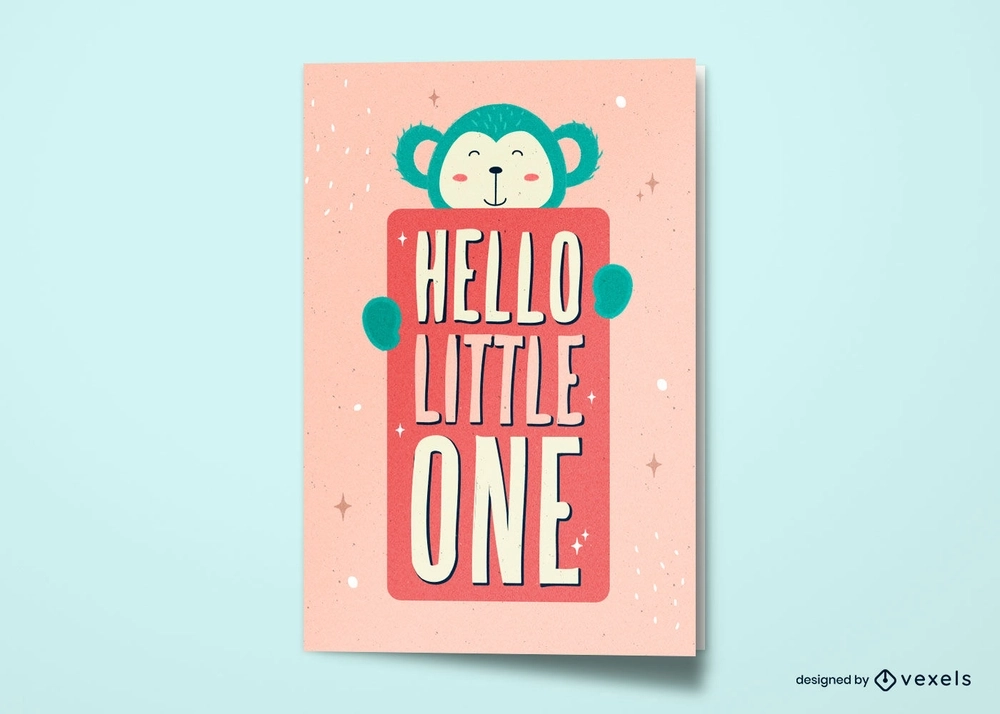 Adorable greeting card design for new babies that features a monkey holding a sign that says "Hello little one". Contains editable text, colors and more, enjoy!
