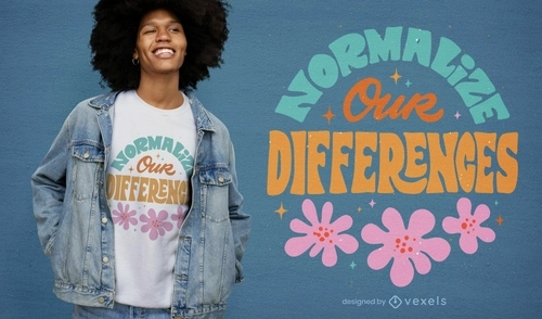 Beautiful t-shirt design featuring the quote "Normalize our differences" with flowers and sparkles. Can be used on t-shirts, hoodies, mugs, posters and any other merchandise. Ready to use on Merch by Amazon, and other print-on-demand platforms like Redbubble, Teespring, Printful and others.