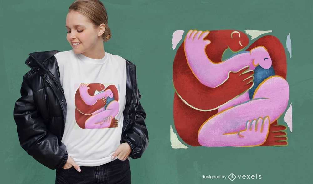 Cool t-shirt psd that features an abstract painting of two people hugging. Print Ready T-Shirt PSD design to sell merch on PODs. This editable tee template also comes with transparent PNG.