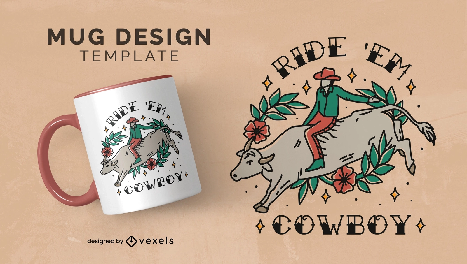 Great mug design featuring a man riding a bull with flowers, leaves and the quote "Ride em cowboy". Make your own mug with this amazing editable AI cup design. Comes with a JPG, AI and transparent PNG. Works great on any Merch POD platform!