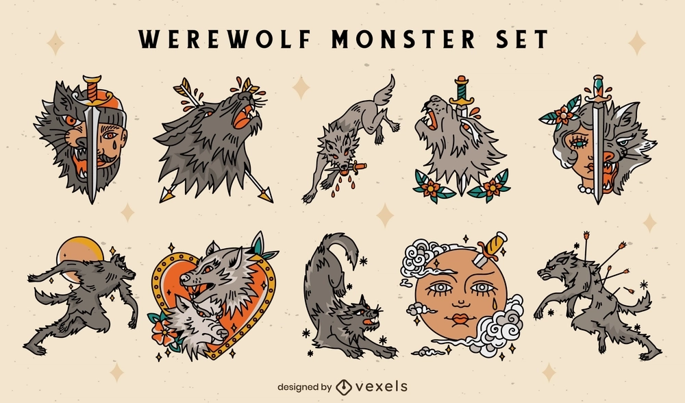 Awesome monster-themed character set that features werewolves with different weapons such as arrows, daggers and swords. Edit and use these character designs for your motion graphic projects, website designs, banners, social posts and more. Editable colors and shapes using Illustrator.