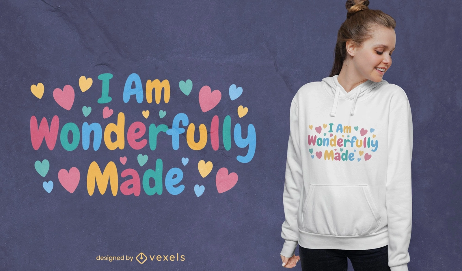 Beautiful t-shirt design that features the quote "I am wonderfully made" surrounded by hearts. Use this print ready design for tshirts, posters, mug, hoodies and other merch products. Eligible to be used on POD platforms like Merch by Amazon, Teespring, Redbubble, Printful and more.