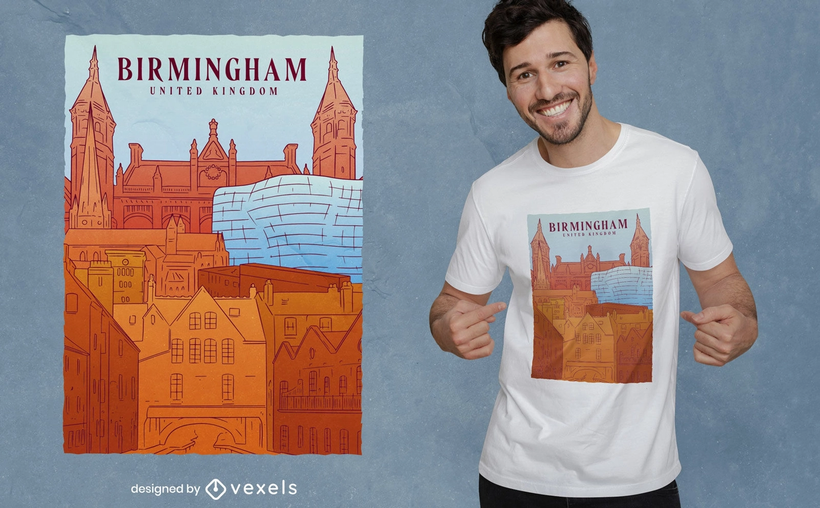 Cool t-shirt design that features a poster of Birmingham city in england with buildings and houses. Can be used on t-shirts, hoodies, mugs, posters and any other merchandise. Ready to use on Merch by Amazon, and other print-on-demand platforms like Redbubble, Teespring, Printful and others.
