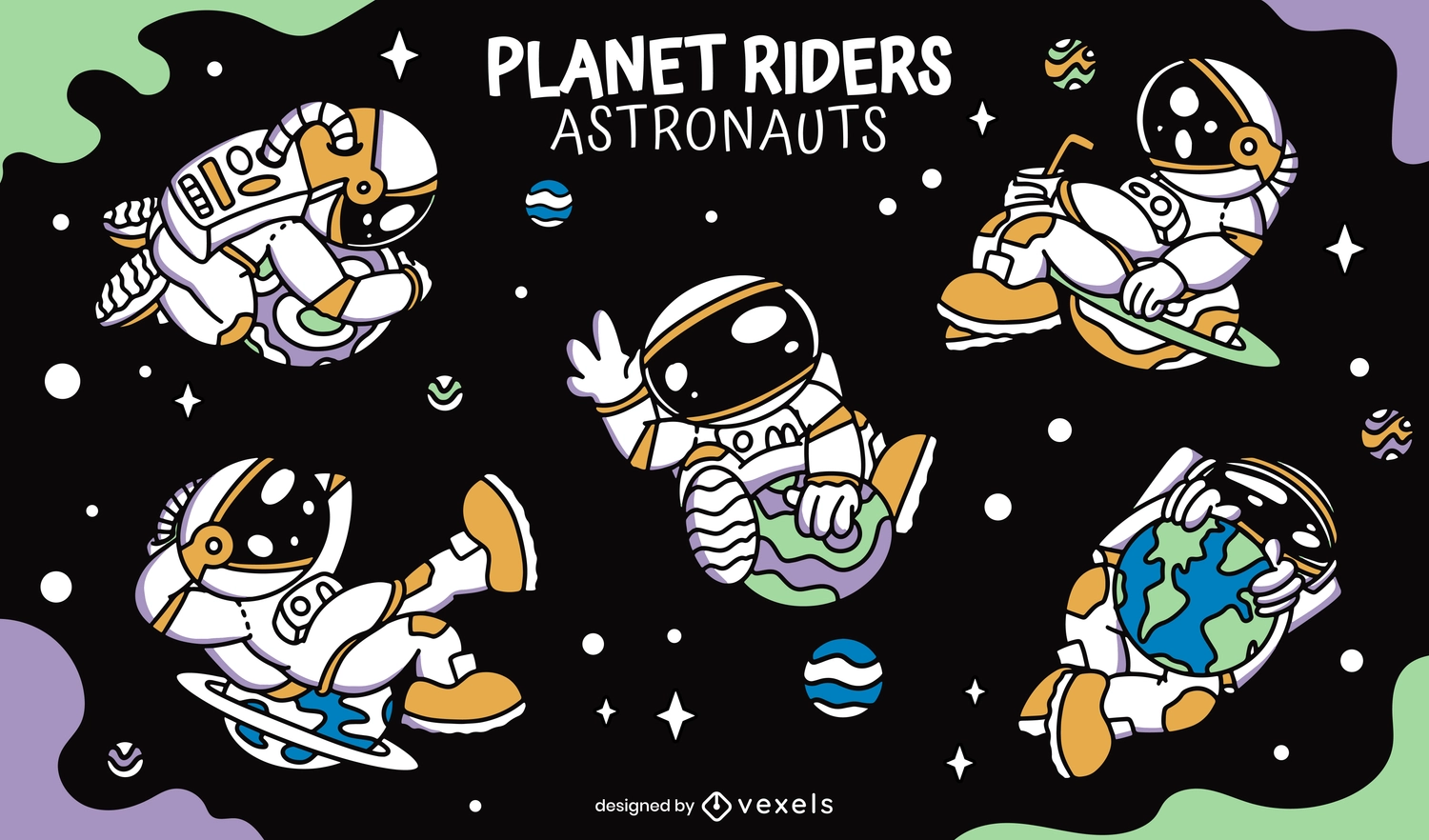 Check out this cool character set including different astronauts riding planets! These Character Designs are perfect to use in website designs, motion graphic design, app designs, banners, posters, and more!