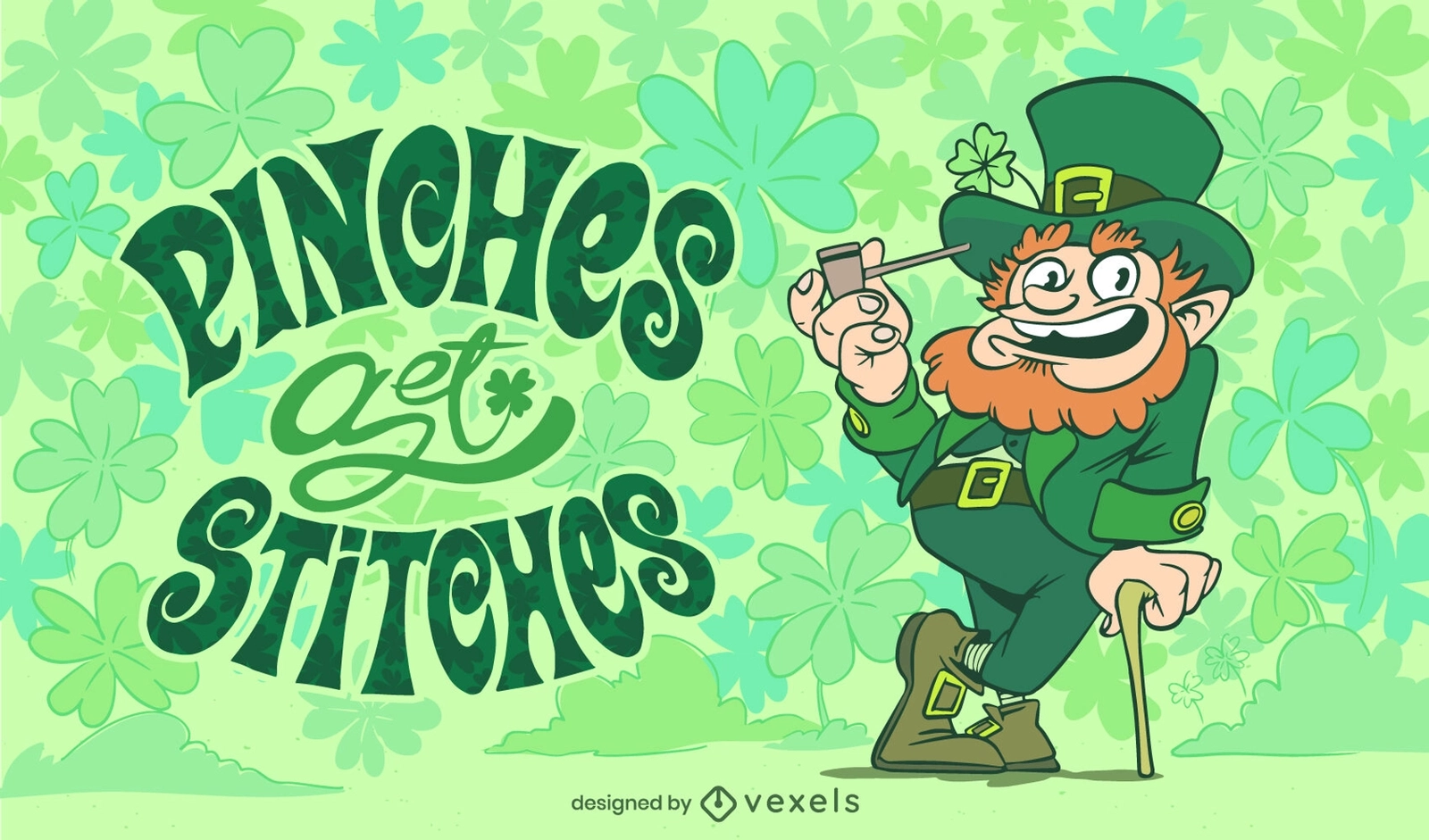 A cool illustration that features a Leprechaun character and the quote "Pinches get stitches" with four-leaf clovers at the back.