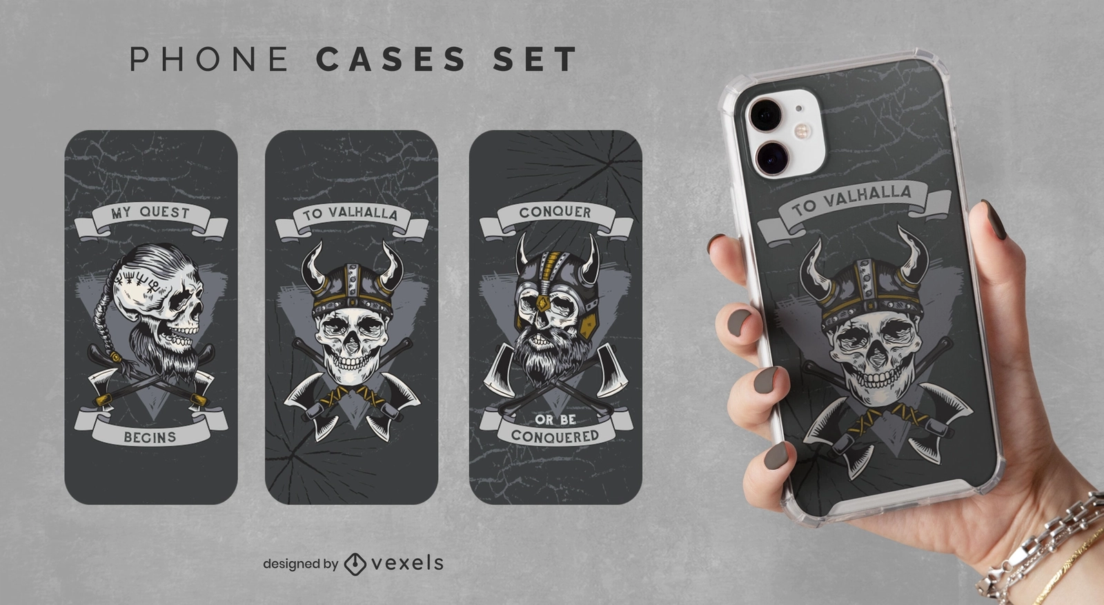 Amazing phone case set that features three different skulls with Viking elements and quotes. These phone case designs are perfect for iPhone and Samsung phone devices, and they're ready to be used on POD platforms like Merch by Amazon, Redbubble, Printful, Etsy, and others.