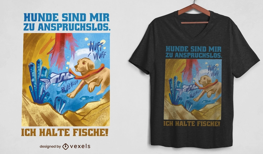 Cool t-shirt design that features a dog diving in an aquarium and the quote "Hunde sind mir zu anspruchslos. Ich halte fische!". Can be used on t-shirts, hoodies, mugs, posters and any other merchandise. Ready to use on Merch by Amazon, and other print-on-demand platforms like Redbubble, Teespring, Printful and others.