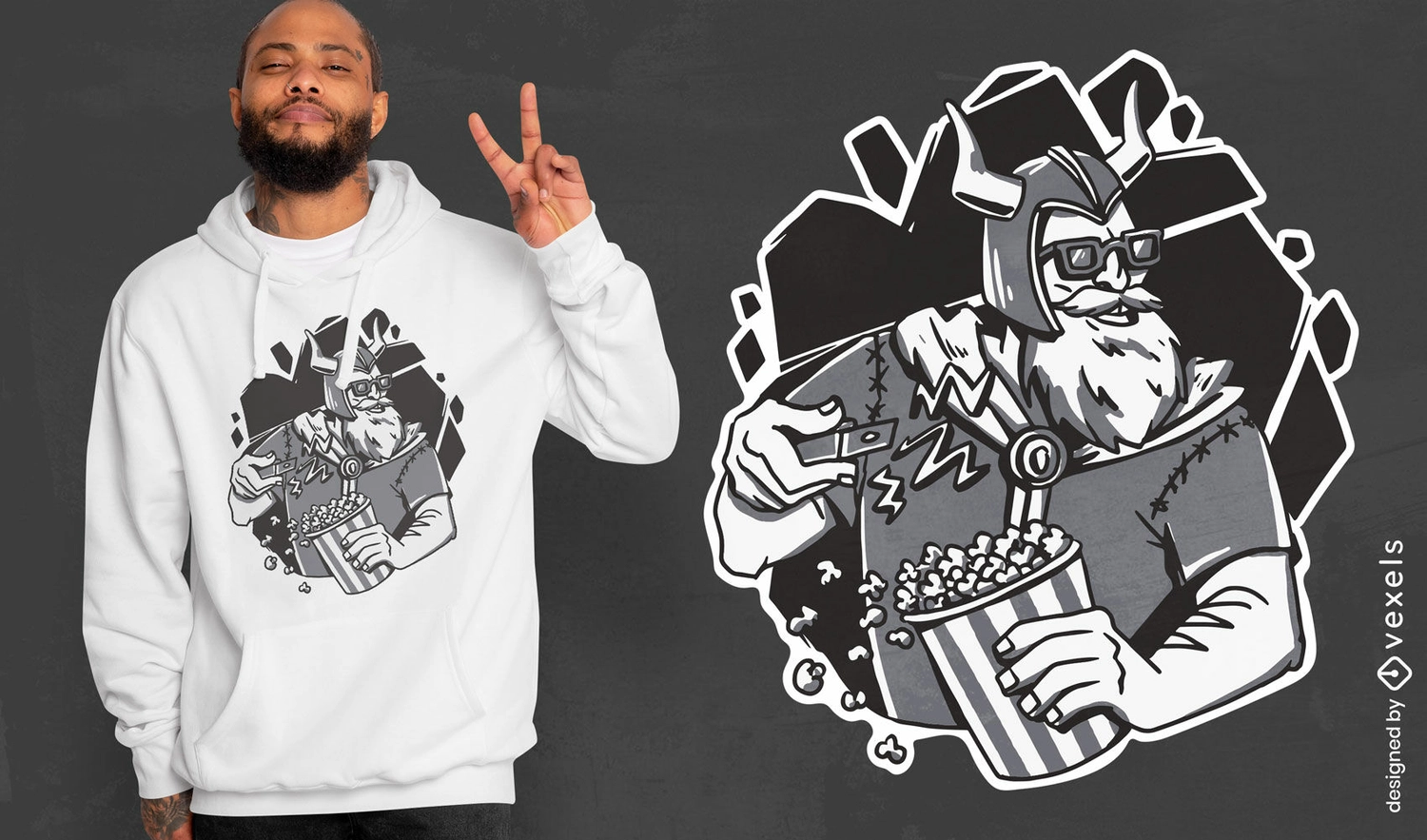 Cool t-shirt design featuring a monochromatic warrior holding a remote control on one hand and a popcorn bucket on the other. Use this print ready design for tshirts, hoodies and other merch products. Eligible to be used on POD platforms like Merch by Amazon, Teespring, Redbubble, Printful and more