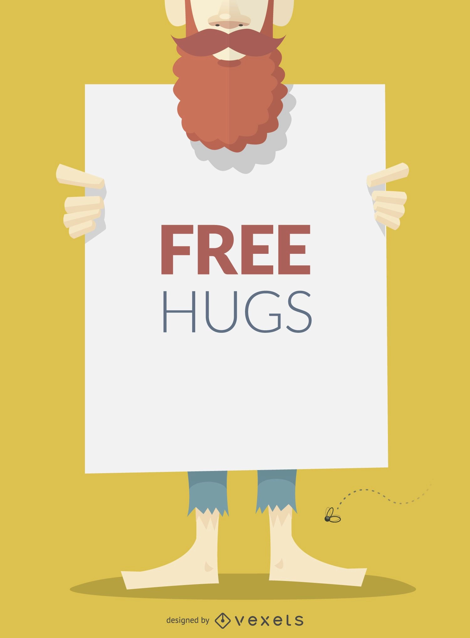 Flat design featuring a man with a beard and a sign that says free hugs. The character also has ripped jeans and is barefoot. Backdrop is yellow but all colors are customizable. Perfect for posters greeting cards wallpapers backgrounds anything!